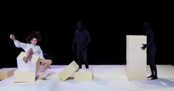 Au plateau, des blocs de mousse, légers et éphémères, s’assemblent sous nos yeux par des manipulateurs pour former un être scénographique mouvant, à la fois décor et créature, tandis que la partition très cinématographique signée Laurent Nicolas incarne tantôt son cœur battant, tantôt sa conscience tourmentée.