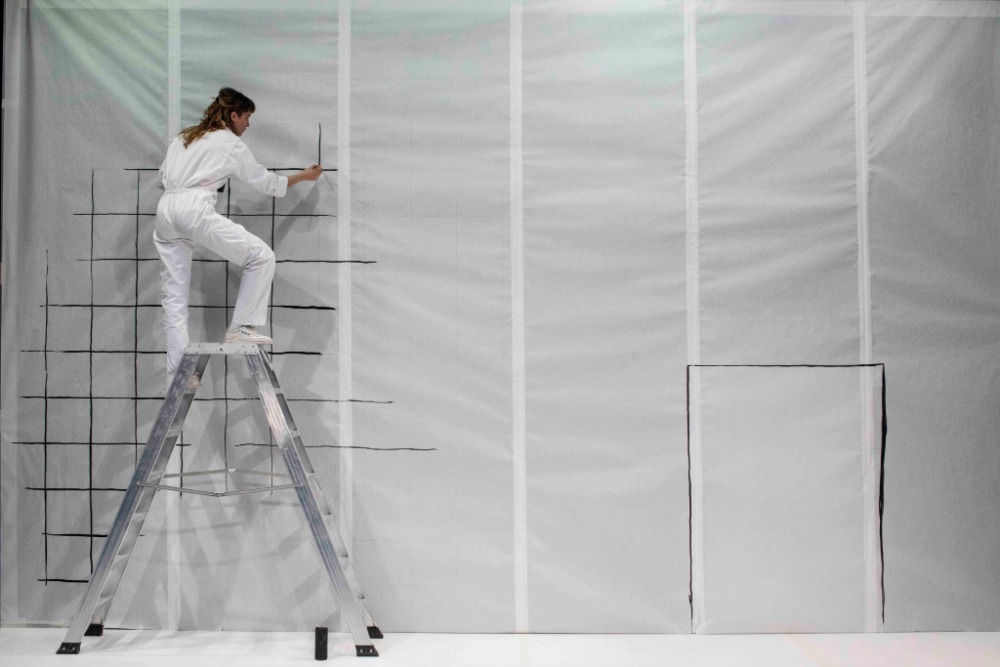 Peu à peu, l’espace scénique se modifie: on passe d’une sorte de chambre mortuaire, de limbes aussi, à un atelier d’artiste, tout en gardant les traces de ces espaces.