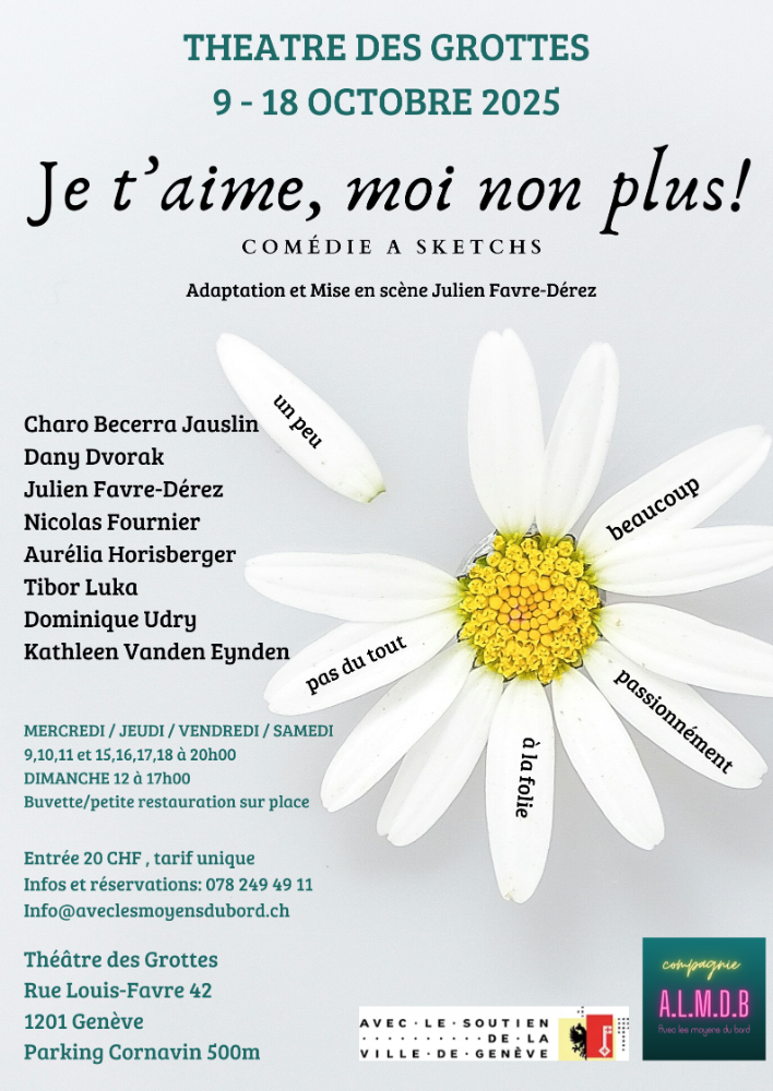 Je t'aime, moi non plus!, une comédie de Julien Favre-Dérez à découvrir du 9 au 18 octobre 2025 au Théâtre des Grottes, Genève.